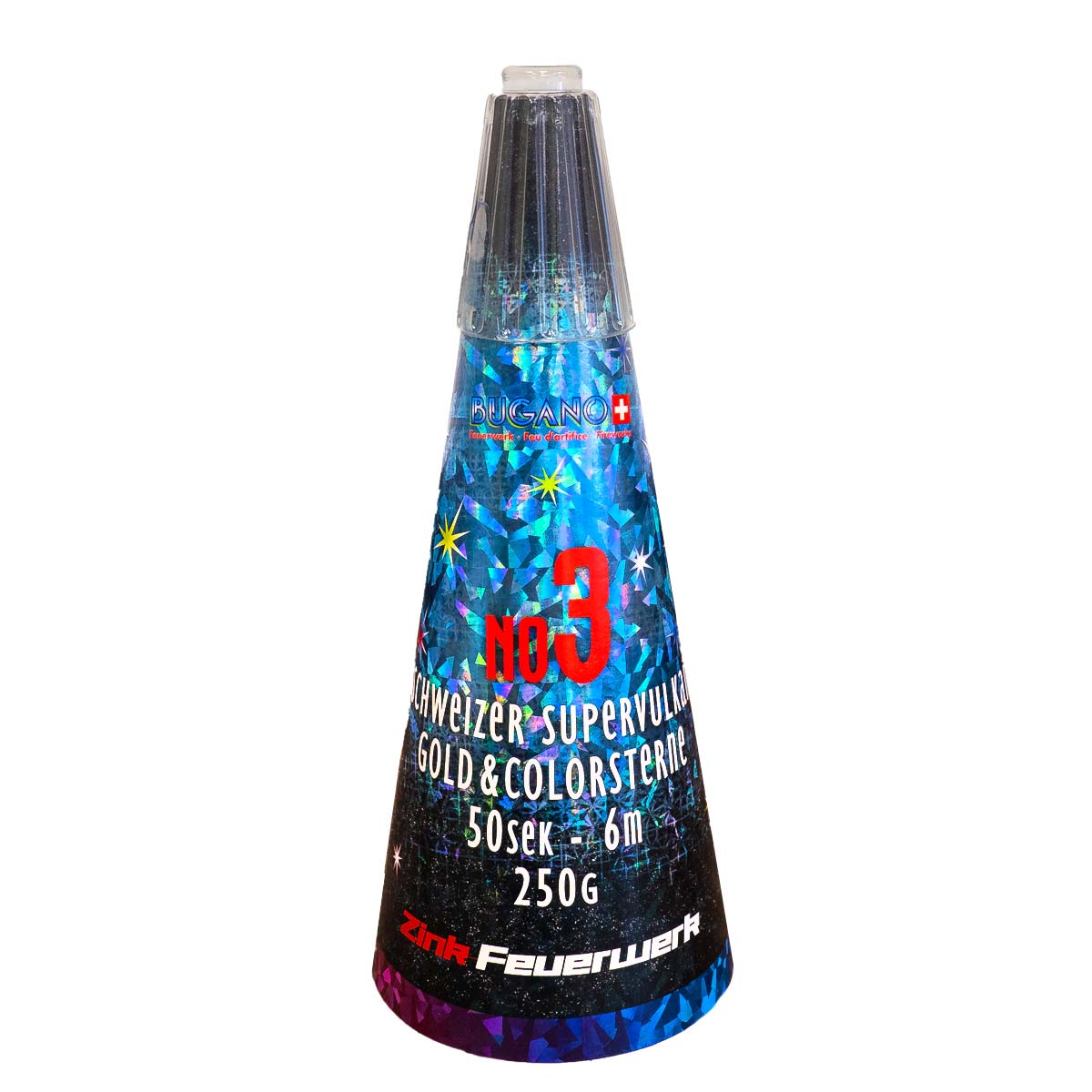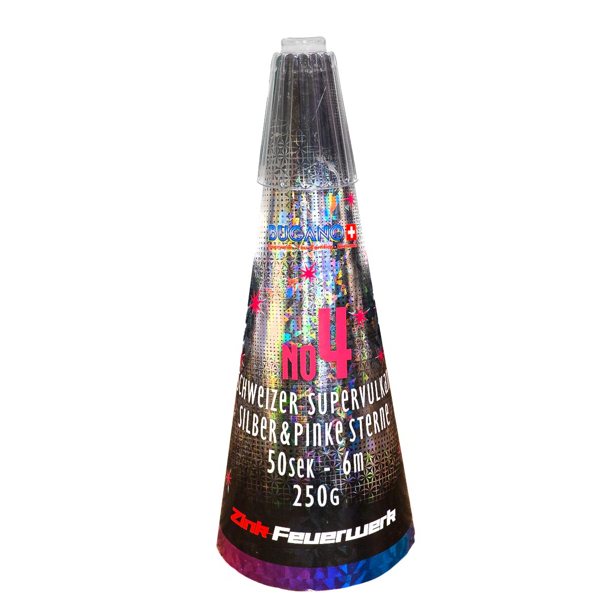 Vulkan mit Silberfunken kombiniert mit pinken Sternen, ein ganz besonderer Effekt. Der Vulkan überzeugt durch Perfektion in Herstellung und Verarbeitung (Bugano, Schweiz) und durch Steighöhe, Brenndauer und Effektkombination. Die Brenndauer des Vulkans beträgt ca. 50s, die Effekthöhe steigert sich bis auf 6m. Mit 250g NEM reizt dieser Vulkan die maximal zulässige Effektmasse aus – mehr geht nicht!