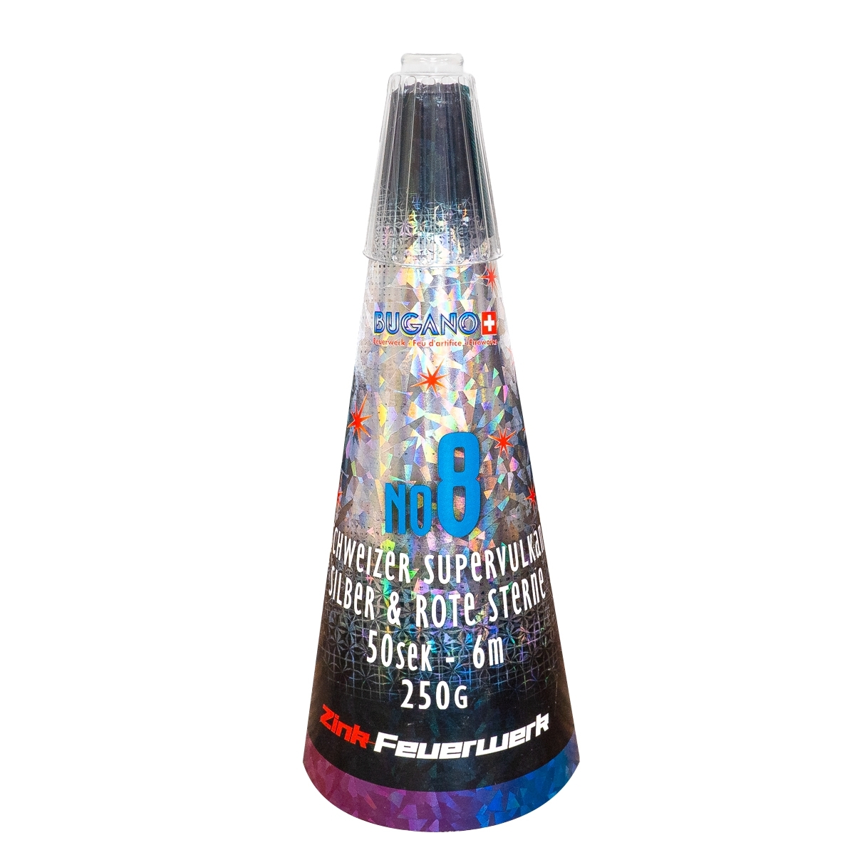 Vulkan mit platzenden Goldfunken kombiniert mit blauen Sternen, ein ganz besonderer Effekt. Der Vulkan überzeugt durch Perfektion in Herstellung und Verarbeitung (Bugano, Schweiz) und durch Steighöhe, Brenndauer und Effektkombination. Die Brenndauer des Vulkans beträgt ca. 50s, die Effekthöhe steigert sich bis auf 6m. Mit 250g NEM reizt dieser Vulkan die maximal zulässige Effektmasse aus – mehr geht nicht!